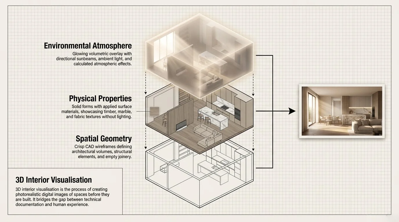 3D interior visualisation is the process of creating photorealistic digital images of interior spaces before they are built or renovated. Using specialist software, a visualisation artist constructs a three-dimensional model of a room or building interior, applies accurate materials and lighting, and renders the result as a high-resolution image or animation.